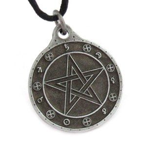 A simple and powerful protective talisman cast in pewter. The central pentagram is surrounded by the alchemical symbols for the seven classical planets. The reverse side has a pair of wings and a triple knot, symbols of Angelic power and Divine order.