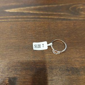 Ring feature a delicate band in a rose gold tone shaped like a princess crown, showcase 3 faux diamonds cut into heart shapes as the center piece.