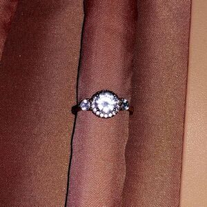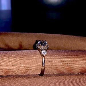 Size 7, silver Charmed Aroma Ring. Circular centre stone with smaller stones surrounding and a medium stone on each size