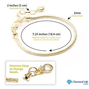 Adjustable Design: Your bracelet comes ready to wear, filled with beads and charms on a gold-plated snake chain bracelet. The lobster clasp twists open on one end so that the bracelet can easily be re-arranged or added to.