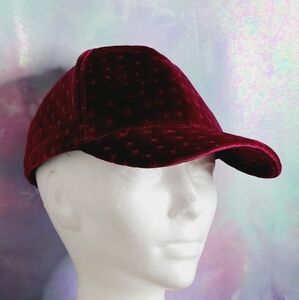 Gorgeous dark cherry red velvet baseball cap with stars designed all over. Adjustable velcro strap at the back accommodates most head sizes. Very unique & eye catching!