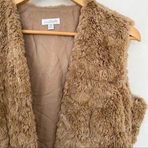 Charming Charlie faux fur vest in a tan colour. Very soft. Pictured here with an Eddie Bauer cotton flannel plaid shirt, available in a separate listing.
