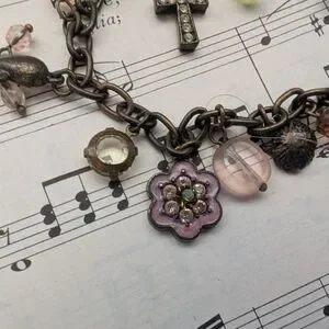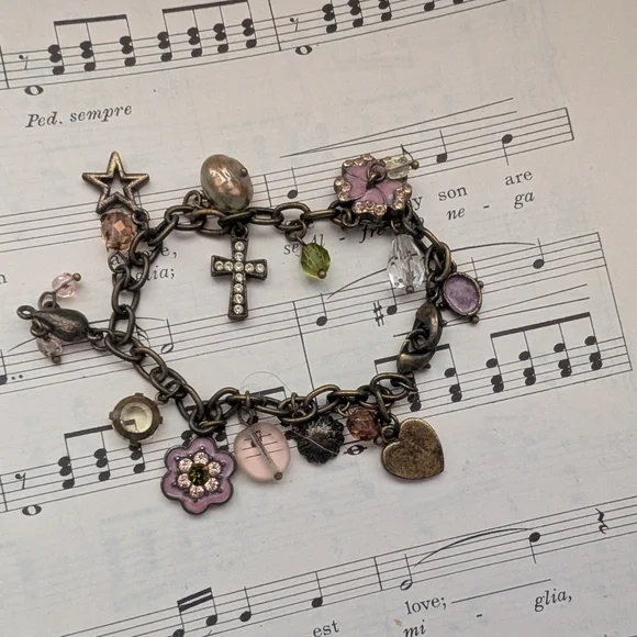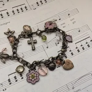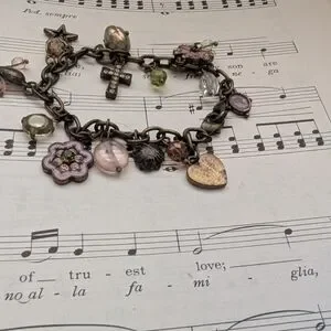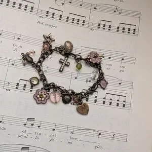 This elegant charm bracelet features a variety of colorful charms, perfect for adding a touch of whimsy to any outfit. The bracelet includes shades of pink, purple, and green, making it a versatile accessory for any occasion.