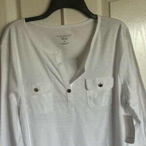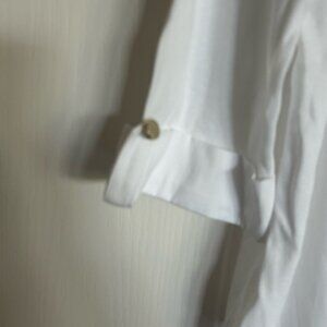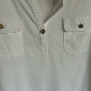 Charter Club Luxury Pima cotton white 3/4 sleeve T shirt with split neck, gold buttons, and placard pockets.