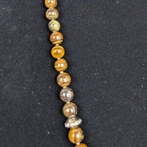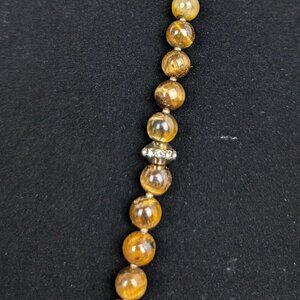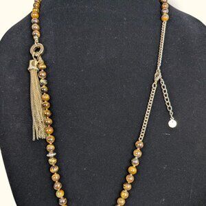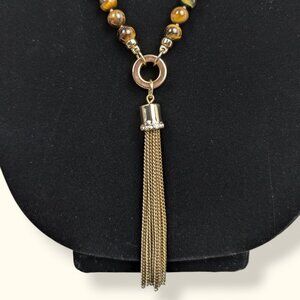 This contemporary necklace by Charter Club is beaded and has a gold tone adjustable lobster claw closure. The beads appear to be made of tiger eye but may also be glass designed to look like tiger eye. There are also a couple stones on either side that have white/clear rhinestones that go all the way around them. At the very front of the necklace there is a gold tone ring connecting both sides of the necklace, with a metal tassel dangling down. There is also a maker's tag near the clasp that is stamped Charter Club. The necklace has minor wear.