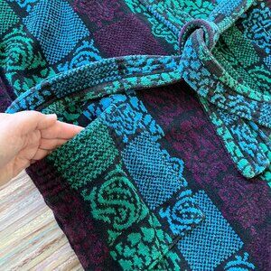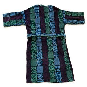 Vintage Charter Collection (The Bay), thick terry cloth bathrobe in a multi-color geometric print. 100% cotton, made in Brazil. Two front pockets, tie belt at waist. Belt has double loops at each side to accommodate different sizes. Tagged as "One Size", fits most adults, see below for measurements.