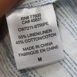 Button down cami. Scoop neckline. Ruffle sleeves. Criss Cross Strap. White with blue stripes. Loose Fit. Curved Hem. 55% linen, 45% cotton.