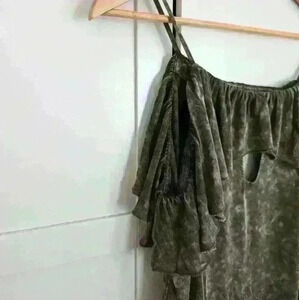 Nwt Chaser Green acid wash top with spaghetti straps, oval cutout on front and back, ruffles around neck and under arms and waterfall effect on bottom. Length across chest 19", height from shoulder to bottom in middle 24" dropping to 26" on sides. 93% viscose, 3% spandex. Very soft material