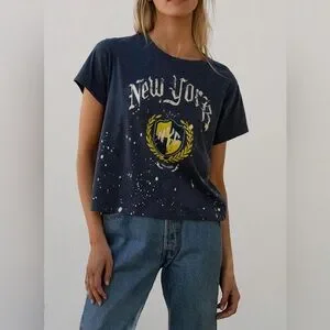 Indulge in the sophistication of this New York tee featuring a stunning vintage aesthetic with faded letter printing, paint splatter, and a glamorous motif. The yellow shield, white print, and sapphire blue recycled polyester fabric create a striking combination that pairs perfectly with a leather jacket, adding an edgy touch to the overall design. The gracefully roomy fit and elegant scoop neck add a touch of chic to this stylish piece.