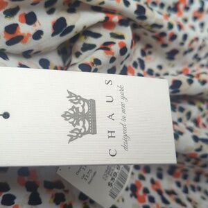 This Chaus blouse features a striking asymmetrical design in vibrant red and blue hues. The long sleeves and soft fabric ensure comfort, while the unique front tie style adds a touch of elegance to any outfit. perfect to wear with leggings, tights, or jeans.