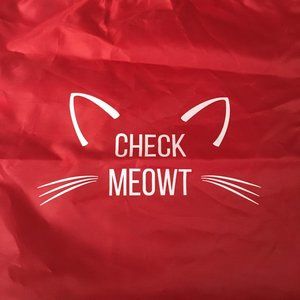 Excellent unused condition Toronto Cat Rescue red reusable book and grocery tote featuring white printed illustrated slogan, 'Check Meowt' with black adjustable corded rope string. This cute bag that can be worn over one arm or as a backpack is great to use for your every day errands. Help the environment and support animal love while doing it! No longer sold on the website.