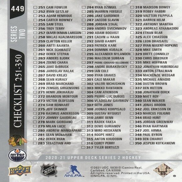 Checklist Card - 2020/2021 UD Series 2 Hockey 251-350 - Card Number 449