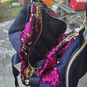 Stand out with this stylish Cheer tote bag featuring vibrant pink sequins and bold gold lettering. Perfect for carrying your essentials with flair.
