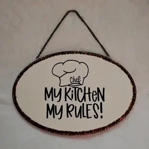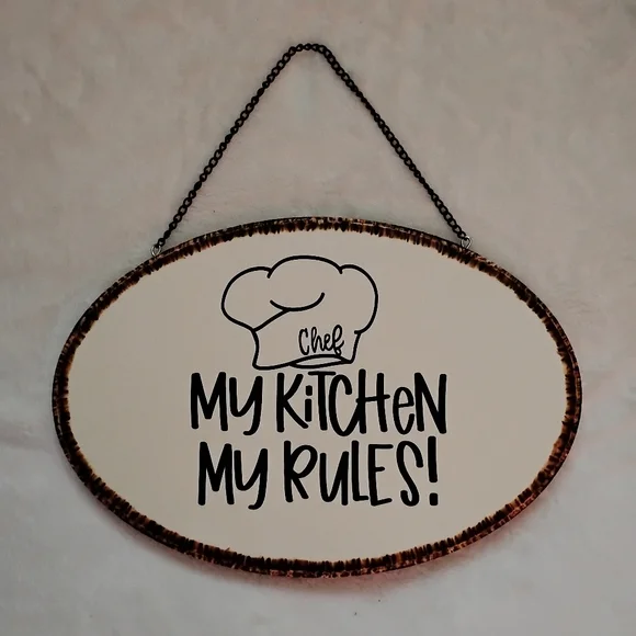 Oval wall sign with 'My Kitchen My Rules!' text. Features a chef hat graphic. Perfect for kitchen decor.