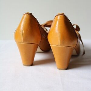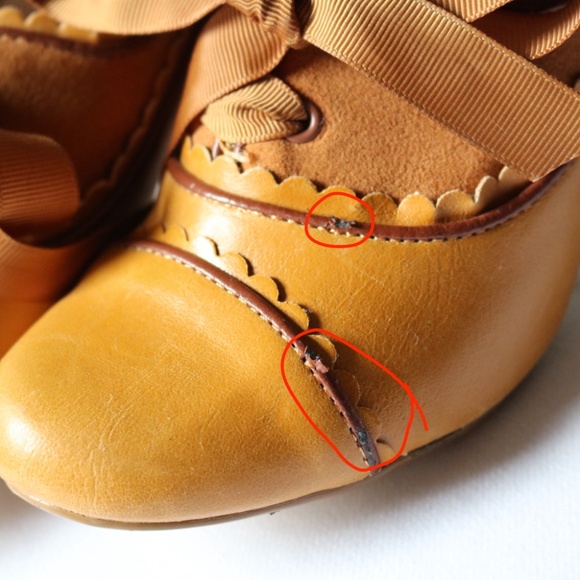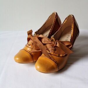 Cute Oxford inspired heels by Chelsea Crew, 'Madison'. Yellow-brown with scalloped details and ribbon lace up in women's size EU 36 (US 5.5). Pre-owned and in good condition. NOTE: there are some marks on the outside of shoes from normal wear but this does not affect functionality. Please see last 3 pics for close up of marks. Smoke-free, pet friendly home!