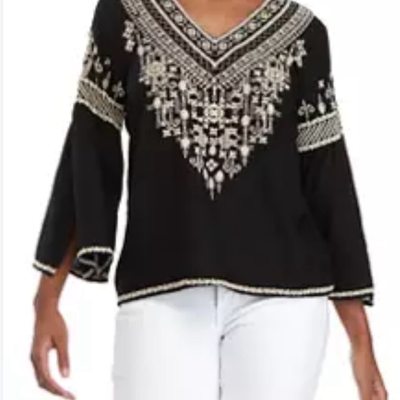 This black tunic from Chelsea & Theodore features a relaxed fit with embroidered beige tones. The 3/4 length bell sleeves and flowing fabric make it perfect for a casual yet stylish look.