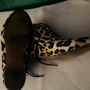 Zara Chelsea boots. Ankle length. Leopard print coarse hair style with lace ups. Regular wear on sole. Have not been worn in 5 years. Lots of life left in them. Super stylish with leggings.