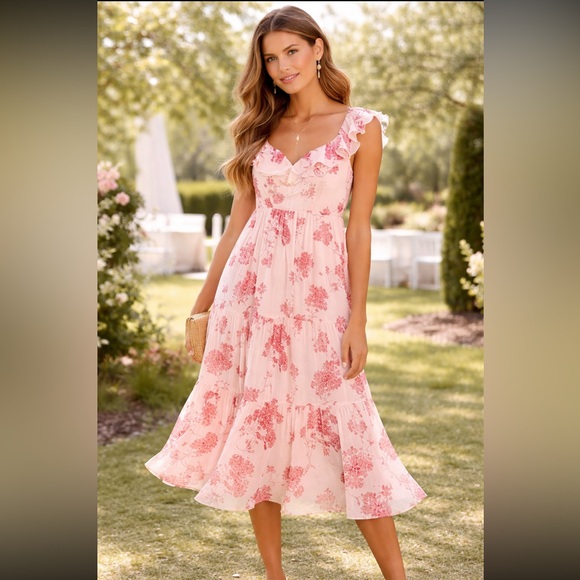 Enchanting blooms cover this blushing chiffon midi styled with a frill-trimmed neckline and romantically ruffled skirt