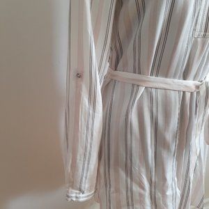 Tunique de belle qualité très douce blanche avec fines rayures rose et noir. Small, Camber et Grace.