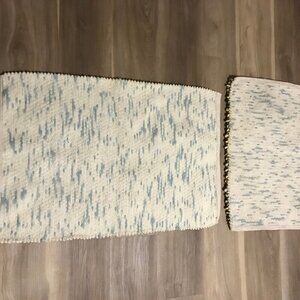 The rugs are a white and light blue color, the larger rug measures 31" x 20" and the smaller rug measures 25" x 17". Water absorbent thick looped chenille that is washable.