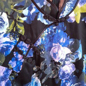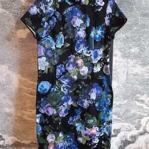 Pretty black cheongsam dress featuring a pink and blue floral print.