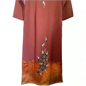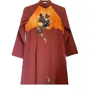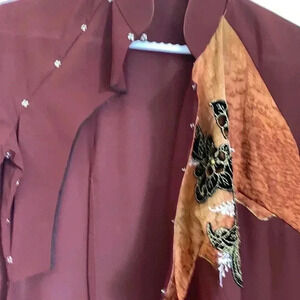 The chocolate brown fabric is some kind of wrinkle resistant light nylon. The orangey brown panel at the top and bottom seems to be crushed velvet. The embroidery is velvet as well, outlined with gold thread, and white paint.