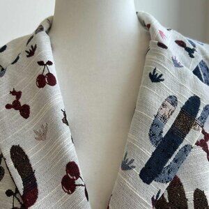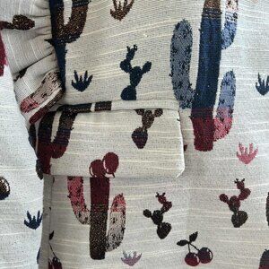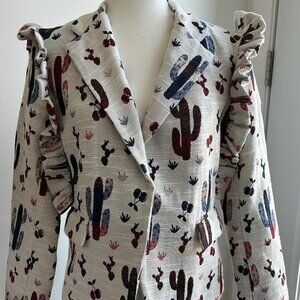 Chepè is a boutique Italian label known for playful jacquards and fabric-driven tailoring. This statement blazer blends a desert-chic cactus motif with subtle metallic thread for refined shimmer, framed by sculptural ruffle shoulders and a clean single-button front. Style with vintage denim and ankle boots for Western polish, or wear it with a mxi skirt and heels for art-night glamour.