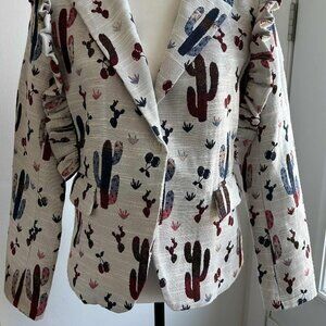 #chepe #cactus #jacquard #ruffleshoulder #metallicthread #statementblazer #madeinitaly #encorestudio #italianfashion #westernvibes