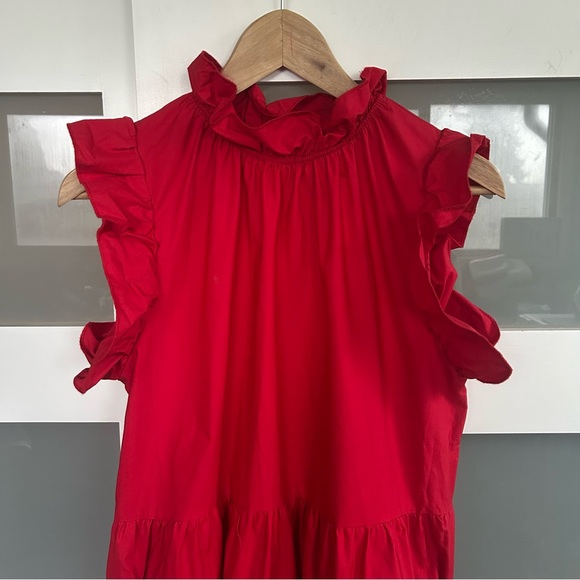Elegant red maxi dress with charming ruffle details. Perfect for any occasion.