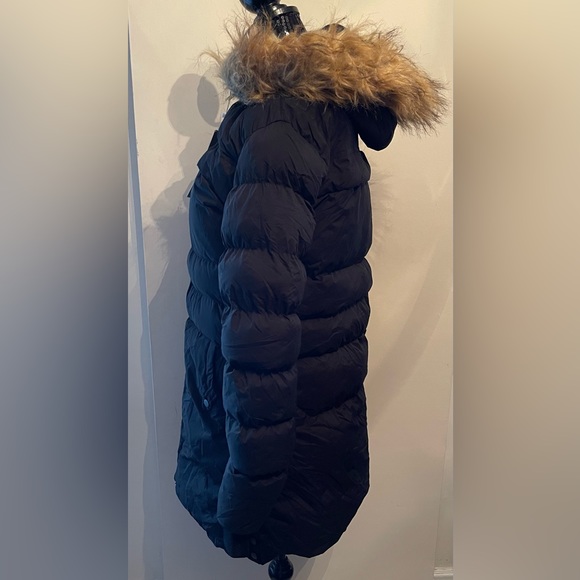 Cherfly Black Vegan Mid Length Coat, faux fur, snaps at the bottom both side of coat two hip pockets. condition is new with tag.