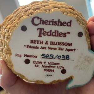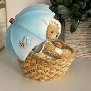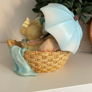 Cherished Teddies “Friends are Never Far Apart”. Two bears with an umbrella and a stuffed bunny in a basket.