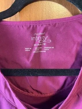 Cherokee Infinity scrub top in rich magenta. V-neck styling with smooth neckline. Subtle tailored seaming for shape. Clean, solid color throughout.