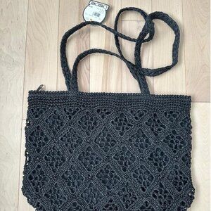 Super rare vintage Cherokee crochet tote bag, new with tags (deadstock). Black woven crochet design with full fabric lining and zip closure. Double strap design makes it easy to carry as a shoulder bag or tote. Y2K/boho inspired piece, perfect for festivals, summer looks, or as a collectible from an iconic brand.
