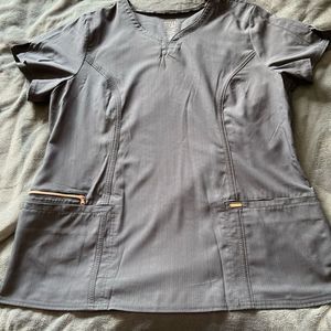 This sophisticated short sleeve top features rose-gold hardware, a curved V-neck, and princess seams at front and back for a slim fit. Knit piecing at the side and center back panels provide added comfort and flexibility. Additional design details include a decorative zig-zag coverstitch at the front seaming, two welt pockets at the waist, a secure zip pocket at the wearer's right, and side vents for ease of movement. Contemporary fit. Center back length: 26" This elegant linear dobby stretch fabric and comfort jersey knit is a chic combo great for a stylish medical professional that makes a STATEMENT!