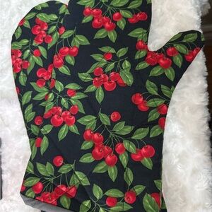 Oven mitt with vibrant cherry pattern. Features red cherries and green leaves on a black background.