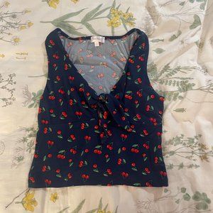 This stylish sleeveless top features a playful cherry print on a dark background. Perfect for casual outings, it adds a touch of fun to any wardrobe.