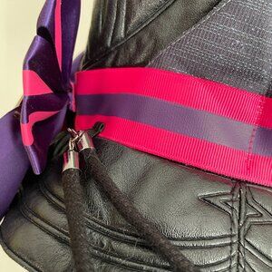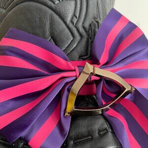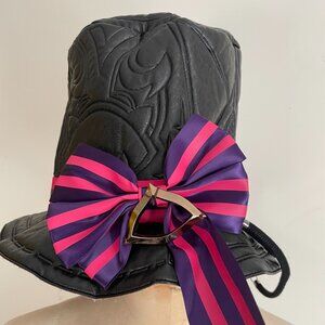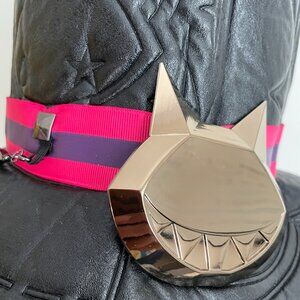 Front features a shiny metallic Cheshire Cat face emblem with wide grin