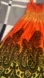 Bright orange dress with black pattern. Smocked bodice and thin straps.