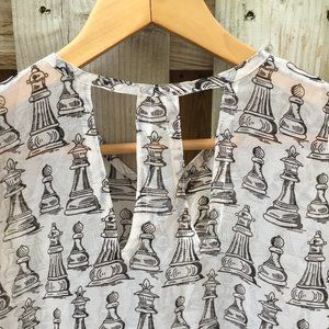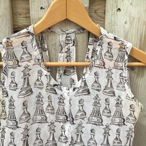Handmade chess-themed sleeveless sheer blouse in fair pre-owned condition.