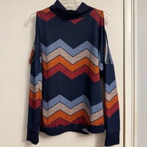 Stylish cold shoulder top with chevron pattern. Features navy, red, orange, and gray colors.