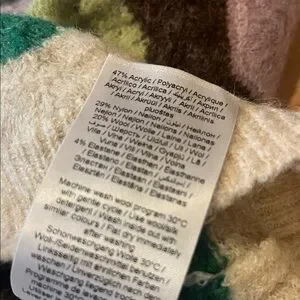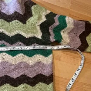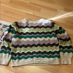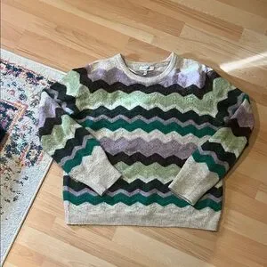 Stylish chevron pattern sweater with green, purple, and cream colors. Perfect for casual wear. Stretchy wool blend.