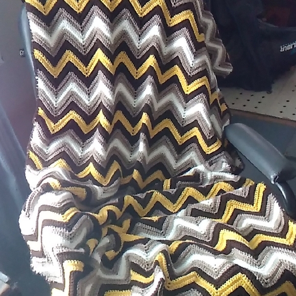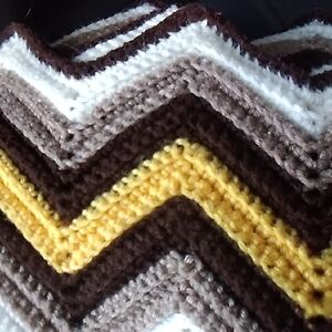Handmade crocheted blanket Cozy chevron patterned blanket with yellow, brown, and cream stripes. Perfect for adding warmth and style to any room.The blanket is 40" X 82" is great shape.