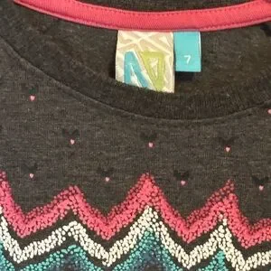 Chic dress with a chevron pattern in pink, blue, and gray. Ideal for a cozy style.