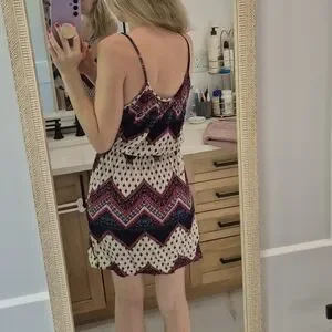 Stylish dress with a chevron pattern. Features a mix of red, blue, and cream colors.