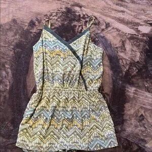 Stylish chevron patterned skort romper featuring a blend of blue and gold tones. Perfect for any occasion. Fully lined for comfort and fit