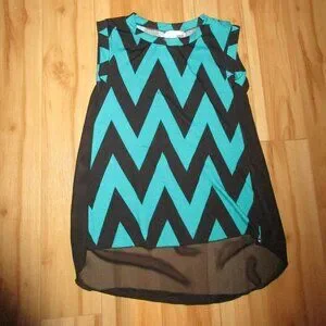 Sheer-back tunic, with herringbone print in front. Stretch jersey. Brand : Hot Ginger. Fabric : 62% cotton/32% rayon/6% spandex. Color : Turquoise and black. Size : S.