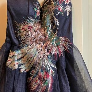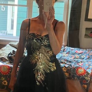 Black with multi-colored sequence. US size 6. Waist expands 22-30. Knee length, about 30”. She’ll, polyester. Lining polyester and spandex. Built in bra. Has removable straps so can be worn strapless.