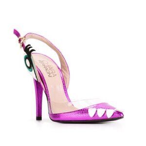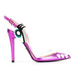 Stylish purple heels with unique design. Features clear accents and playful details. Perfect for a bold look.