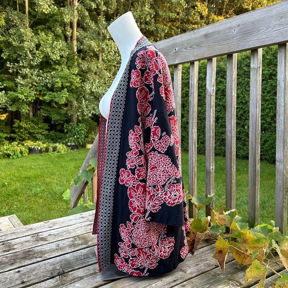 Chiaramente open front cardigan, size small. 3/4 kimono sleeve with dropped shoulders. Red flowers on navy blue background. Unlined, no pockets. 50% cotton, 50% acrylic.
