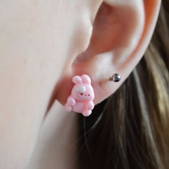 Adorable handmade stud earrings set featuring a cute chibi bunny and dinosaur. Handmade from upcycled charms and hypoallergenic stud posts, perfect for sensitive ears.